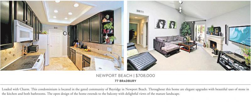 NEWPORT BEACH | $708,000 77 BRADBURY Loaded with Charm. This condominium is located in the gated community of Bayridge in Newport Beach. Throughout this home are elegant upgrades with beautiful uses of stone in the kitchen and both bathrooms. The open design of the home extends to the balcony with delightful views of the mature landscape.