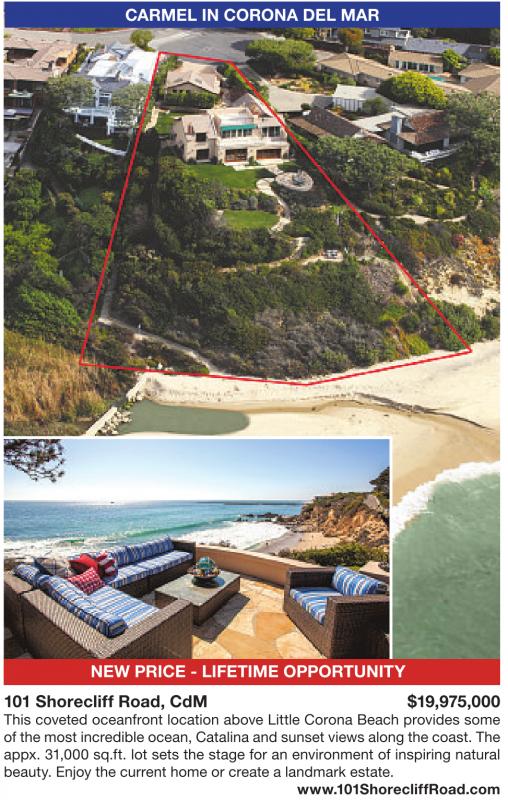 101 Shorecliff Road, CdM $19,975,000 This coveted oceanfront location above Little Corona Beach provides some of the most incredible ocean, Catalina and sunset views along the coast. The appx. 31,000 sq.ft. lot sets the stage for an environment of inspiring natural beauty. Enjoy the current home or create a landmark estate.