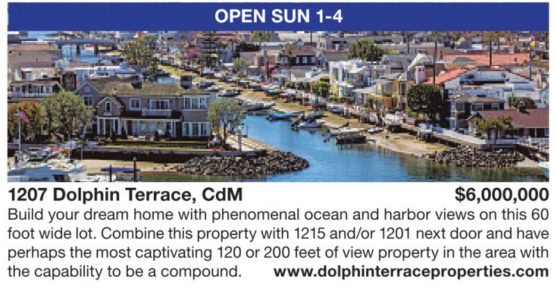 1207 Dolphin Terrace, CdM $6,000,000 Build your dream home with phenomenal ocean and harbor views on this 60 foot wide lot. Combine this property with 1215 and/or 1201 next door and have perhaps the most captivating 120 or 200 feet of view property in the area with the capability to be a compound. www.dolphinterraceproperties.com
