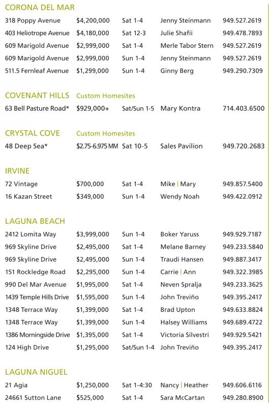 CORONA DEL MAR 318 Poppy Avenue $4,200,000 Sat 1-4 Jenny Steinmann 949.527.2619 403HeliotropeAvenue $4,180,000 Sat 12-3 Julie Shafii 949.478.7893 609 Marigold Avenue $2,999,000 Sat 1-4 Merle Tabor Stern 949.527.2619 609 Marigold Avenue $2,999,000 Sun 1-4 Jenny Steinmann 949.527.2619 511.5 Fernleaf Avenue $1,299,000 Sun 1-4 Ginny Berg 949.290.7309