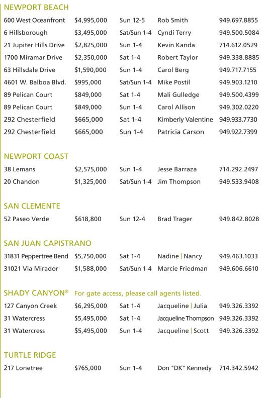 NEWPORT BEACH 600 West Oceanfront $4,995,000 Sun 12-5 Rob Smith 949.697.8855 6 Hillsborough $3,495,000 Sat/Sun 1-4 Cyndi Terry 949.500.5084 21 Jupiter Hills Drive $2,825,000 Sun 1-4 Kevin Kanda 714.612.0529 1700 Miramar Drive $2,350,000 Sat 1-4 Robert Taylor 949.338.8885 63 Hillsdale Drive $1,590,000 Sun 1-4 Carol Berg 949.717.7155 4601 W. Balboa Blvd. $995,000 Sat/Sun 1-4 Mike Postil 949.903.1210 89 Pelican Court $849,000 Sat 1-4 Mali Gulledge 949.500.4399 89 Pelican Court $849,000 Sun 1-4 Carol Allison 949.302.0220 292 Chesterfield $665,000 Sat 1-4 KimberlyValentine 949.933.7730 292 Chesterfield $665,000 Sun 1-4 Patricia Carson 949.922.7399