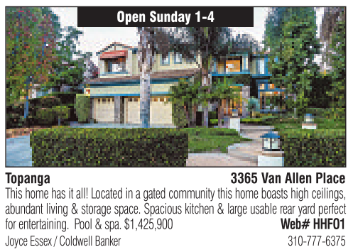 Open Sunday 1-4 Topanga 3365 VanAllen Place Thishomehas it all! Located in agated community this home boasts high ceilings, abundant living&storage space. Spaciouskitchen &large usable rear yardperfect for entertaining. Pool &spa. $1,425,900 Web# HHFO1 Joyce Essex /Coldwell Banker 310-777-6375 See also