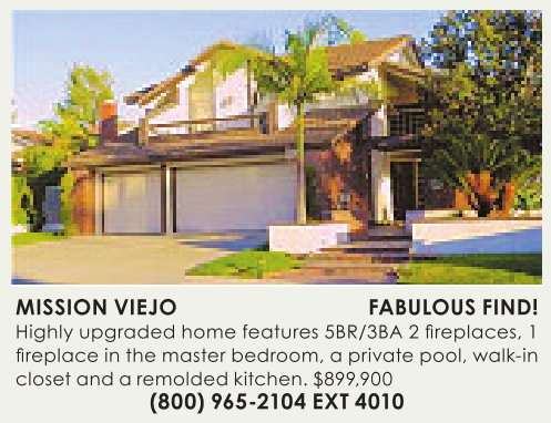 Highly upgraded home features 5BR/3BA 2fireplaces, 1fireplace in the master bedroom, aprivate pool, walk-in closet and aremolded kitchen. $899,900 (800)965-2104 EXT 4010