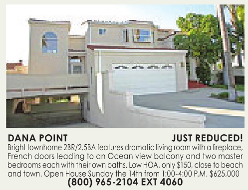 DANA POINT JUST REDUCED! Bright townhome 2BR/2.5BA features dramatic living room with afireplace, French doors leading toanOcean view balcony and twomaster bedroomseachwiththeir ownbaths.Low HOA, only $150,close to beach and town. Open House Sunday the 14th from 1:00-4:00 P.M. $625,000 (800)965-2104 EXT 4060 See also
