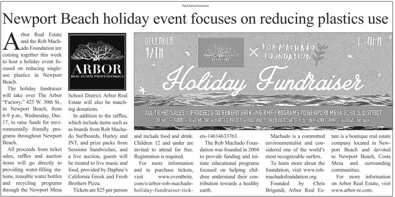 The holiday fundraiser will take over The Arbor “Factory,” 425 W. 30th St., in Newport Beach, from 6-9 p.m., Wednesday, Dec. 17, to raise funds for environmentally friendly programs throughout Newport Beach.