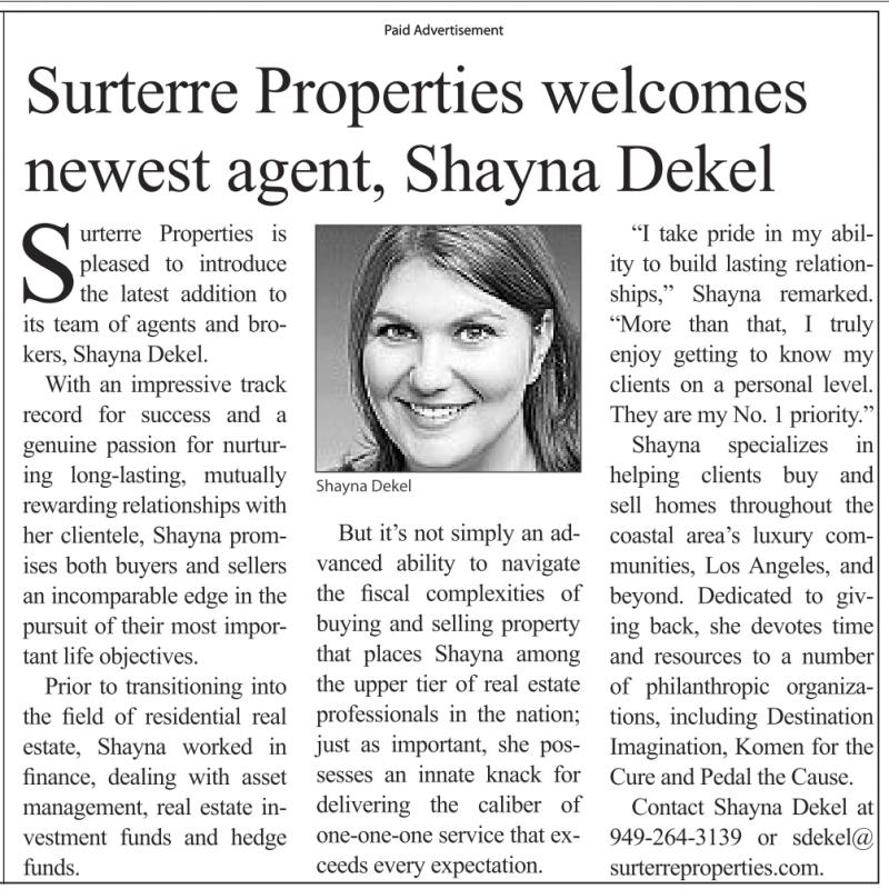 Contact Shayna Dekel at 949-264-3139 or sdekel@ surterreproperties.com.