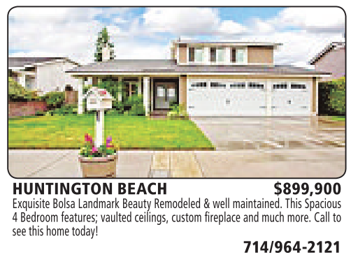 HUNTINGTON BEACH $899,900 Exquisite Bolsa Landmark Beauty Remodeled &well maintained. This Spacious 4Bedroom features; vaulted ceilings, custom fireplace and much more. Call to seethis home today!