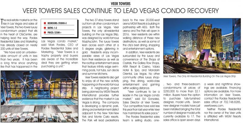 VEER TOWERS SALES CONTINUE TO LEAD VEGAS CONDO RECOVERY