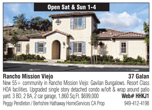Rancho Mission Viejo Open Sat &Sun 1-4 37 Galan New 55+ community in Rancho Mission Viejo: Gavilan Bungalows. Resort Class HOA facilities. Upgraded single story detached condo w/loft &wrap around patio yard.3BD,2BA,2cargarage,1,860 Sq.Ft.$699,000 Web# HHKJ1 Peggy Pendleton /Berhshire Hathaway HomeServices CA Prop 949-412-4198