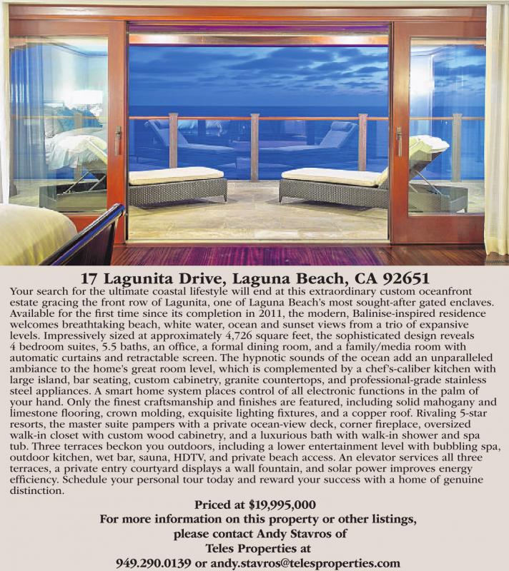 17 Lagunita Drive, Laguna Beach, CA 92651 Your search for the ultimate coastal lifestyle will end at this extraordinary custom oceanfront estate gracing the front row of Lagunita, one of Laguna Beach’s most sought-after gated enclaves. Available for the first time since its completion in 2011, the modern, Balinise-inspired residence welcomes breathtaking beach, white water, ocean and sunset views from a trio of expansive levels. Impressively sized at approximately 4,726 square feet, the sophisticated design reveals 4 bedroom suites, 5.5 baths, an office, a formal dining room, and a family/media room with automatic curtains and retractable screen. The hypnotic sounds of the ocean add an unparalleled ambiance to the home’s great room level, which is complemented by a chef’s-caliber kitchen with large island, bar seating, custom cabinetry, granite countertops, and professional-grade stainless steel appliances. A smart home system places control of all electronic functions in the palm of your hand. Only the finest craftsmanship and finishes are featured, including solid mahogany and limestone flooring, crown molding, exquisite lighting fixtures, and a copper roof. Rivaling 5-star resorts, the master suite pampers with a private ocean-view deck, corner fireplace, oversized walk-in closet with custom wood cabinetry, and a luxurious bath with walk-in shower and spa tub. Three terraces beckon you outdoors, including a lower entertainment level with bubbling spa, outdoor kitchen, wet bar, sauna, HDTV, and private beach access. An elevator services all three terraces, a private entry courtyard displays a wall fountain, and solar power improves energy efficiency. Schedule your personal tour today and reward your success with a home of genuine distinction. Priced at $19,995,000 For more information on this property or other listings, please contact Andy Stavros of Teles Properties at 949.290.0139 or andy.stavros@telesproperties.com