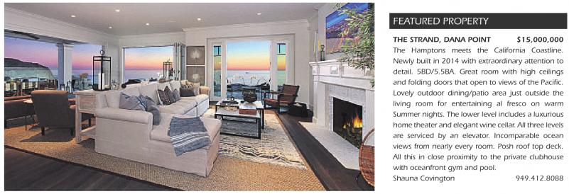 FEATURED PROPERTY THE STRAND, DANA POINT $15,000,000 The Hamptons meets the California Coastline. Newly built in 2014 with extraordinary attention to detail. 5BD/5.5BA. Great room with high ceilings and folding doors that open to views of the Pacific. Lovely outdoor dining/patio area just outside the living room for entertaining al fresco on warm Summer nights. The lower level includes a luxurious home theater and elegant wine cellar.All three levels are serviced by an elevator. Incomparable ocean views from nearly every room. Posh roof top deck. All this in close proximity to the private clubhouse with oceanfront gym and pool. Shauna Covington 949.412.8088