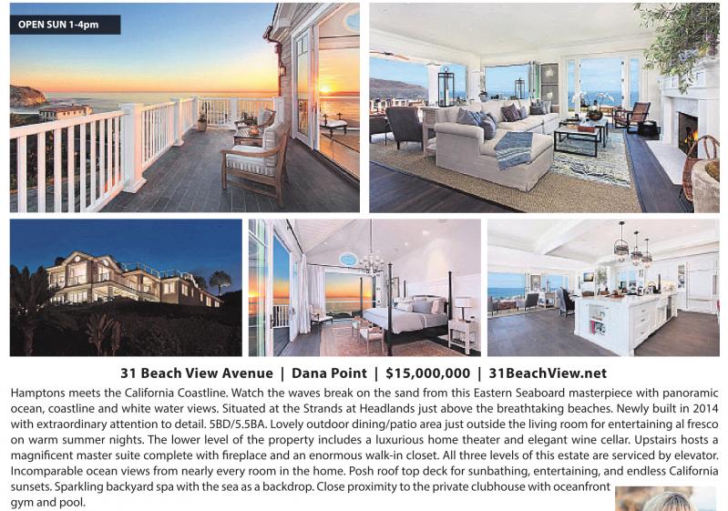 OPEN SUN 1-4pm 31 Beach View Avenue | Dana Point | $15,000,000 | 31BeachView.net Hamptons meets the California Coastline. Watch the waves break on the sand from this Eastern Seaboard masterpiece with panoramic ocean, coastline and white water views. Situated at the Strands at Headlands just above the breathtaking beaches. Newly built in 2014 with extraordinary attention to detail. 5BD/5.5BA. Lovely outdoor dining/patio area just outside the living room for entertaining al fresco on warm summer nights. The lower level of the property includes a luxurious home theater and elegant wine cellar. Upstairs hosts a magnificent master suite complete with fireplace and an enormous walk-in closet. All three levels of this estate are serviced by elevator. Incomparable ocean views from nearly every room in the home. Posh roof top deck for sunbathing, entertaining, and endless California sunsets. Sparkling backyard spa with the sea as a backdrop. Close proximity to the private clubhouse with oceanfront gym and pool.