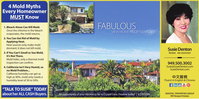 4 Mold Myths Every Homeowner MUST Know 1. Bleach Alone CanKill Mold. Once the chlorine in the bleach evaporates, the mold returns. 2. YouCan GetRid of Mold by Applying Heat. Heat sources only make mold dormant; it does not kill mold. 3. If YouCan’t Smell or SeeMold, It’s Not There. Mold hides, only a thermal mold inspection can confirm. 4. California Isn’t Very Humid,so no Mold Problem... California humidity can get as high as 90%, mold only needs a humidity level of 30 to 50%. “TALK TO SUSIE” TODAY about her ALL CASH Buyers. FABULOUS VIEW HOME AT CRYSTAL COVE An opportunityofyour lifetime to be in Crystal Cove. Preview today! | $3,950,000 SusieDenton Broker BRE#00993999 949.500.3002 Susie@SusieDenton.com SusieDenton.com Fluent in English & Chinese DENTON | PROPERTIES GROUP KW NewportEstates