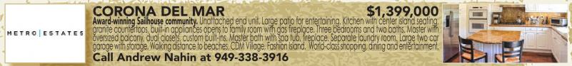 CORONA DEL MAR $1,399,000 C Award-winning Sailhouse community. Award-winning Sailhouse community. Unattached end unit. Large patio for entertaining. Kitchen with center island seating, granite countertops, built-in appliances opens tofamily room with gas fireplace. Three bedrooms and two baths. Master with oversized g balcony, dual closets, custom built-ins. Master bath with spa tub, fireplace. Separate laundry room. Large two car garage with storage. Walkingdistancetobeaches, CDMVillage, FashionIsland. World-class shopping,diningand entertainment. Call Andrew Nahin at 949-338-3916
