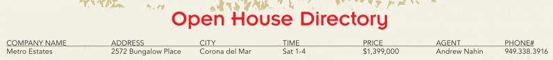 COMPANY NAME ADDRESS CITY TIME PRICE AGENT PHONE# Metro Estates 2572 Bungalow Place Corona del Mar Sat 1-4 $1,399,000 Andrew Nahin 949.338.3916