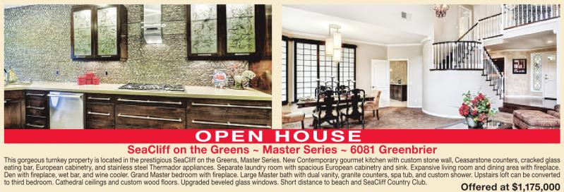 MCCALL O P E N H O U S E SeaCliff on the Greens ~ Master Series ~ 6081 Greenbrier This gorgeous turnkeyproperty is locatedinthe prestigiousSeaCliffonthe Greens,MasterSeries.New Contemporary gourmet kitchenwithcustomstone wall,Ceasarstone counters,cracked glass eating bar, European cabinetry, and stainless steel Thermador appliances. Separate laundry room with spacious European cabinetry and sink. Expansive living room and dining area with fireplace. Den with fireplace, wet bar, and wine cooler. Grand Master bedroom with fireplace. Large Master bath with dual vanity, granite counters, spa tub, and custom shower. Upstairs loft can be converted to third bedroom. Cathedral ceilings and custom wood floors. Upgraded beveled glass windows. Short distance to beach and SeaCliff Country Club. Offered at $1,175,000