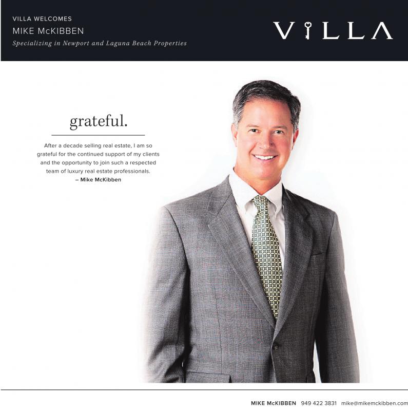 VILLA WELCOMES MIKE McKIBBEN Specializing in Newport and Laguna Beach Properties grateful. After a decade selling real estate, I am so grateful for the continued support of my clients and the opportunity to join such a respected team of luxury real estate professionals. – Mike McKibben MIKE McKIBBEN 949 422 3831 mike@mikemckibben.com