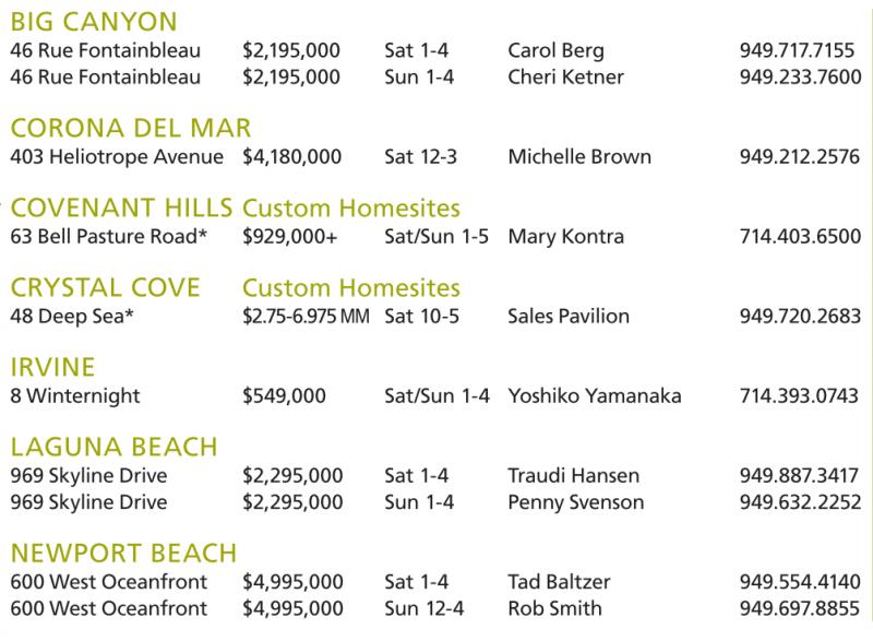 BIG CANYON 46 RueFontainbleau $2,195,000 Sat 1-4 CarolBerg 949.717.7155 46 RueFontainbleau $2,195,000 Sun 1-4 Cheri Ketner 949.233.7600 CORONA DEL MAR 403HeliotropeAvenue $4,180,000 Sat 12-3 Michelle Brown 949.212.2576 COVENANT HILLS Custom Homesites 63 BellPasture Road* $929,000+ Sat/Sun 1-5 MaryKontra 714.403.6500 CRYSTAL COVE Custom Homesites 48 Deep Sea* $2.75-6.975 MM Sat 10-5 Sales Pavilion 949.720.2683 IRVINE 8Winternight $549,000 Sat/Sun 1-4 Yoshiko Yamanaka 714.393.0743 LAGUNA BEACH 969Skyline Drive $2,295,000 Sat 1-4 Traudi Hansen 949.887.3417 969Skyline Drive $2,295,000 Sun 1-4 Penny Svenson 949.632.2252 NEWPORT BEACH 600WestOceanfront $4,995,000 Sat 1-4 TadBaltzer 949.554.4140 600WestOceanfront $4,995,000 Sun 12-4 RobSmith 949.697.8855