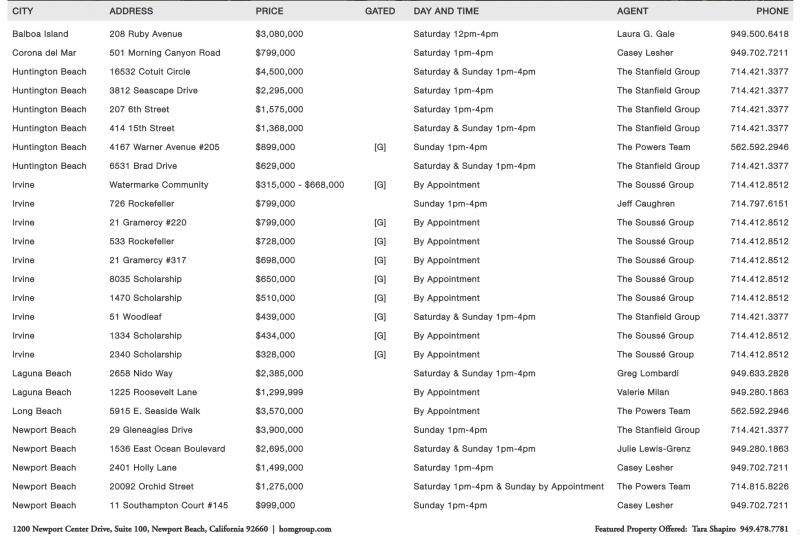 CITY ADDRESS PRICE GATED DAY AND TIME AGENT PHONE Balboa Island 208 Ruby Avenue $3,080,000 Saturday 12pm-4pm Laura G. Gale 949.500.6418 Corona del Mar 501 Morning Canyon Road $799,000 Saturday 1pm-4pm Casey Lesher 949.702.7211 Huntington Beach 16532 Cotuit Circle $4,500,000 Saturday & Sunday 1pm-4pm The Stanfield Group 714.421.3377 Huntington Beach 3812 Seascape Drive $2,295,000 Saturday 1pm-4pm The Stanfield Group 714.421.3377 Huntington Beach 207 6th Street $1,575,000 Saturday 1pm-4pm The Stanfield Group 714.421.3377 Huntington Beach 414 15th Street $1,368,000 Saturday & Sunday 1pm-4pm The Stanfield Group 714.421.3377 Huntington Beach 4167 Warner Avenue #205 $899,000 [G] Sunday 1pm-4pm The Powers Team 562.592.2946 Huntington Beach 6531 Brad Drive $629,000 Saturday & Sunday 1pm-4pm The Stanfield Group 714.421.3377 Irvine Watermarke Community $315,000 - $668,000 [G] By Appointment The Soussé Group 714.412.8512 Irvine 726 Rockefeller $799,000 Sunday 1pm-4pm Jeff Caughren 714.797.6151 Irvine 21 Gramercy #220 $799,000 [G] By Appointment The Soussé Group 714.412.8512 Irvine 533 Rockefeller $728,000 [G] By Appointment The Soussé Group 714.412.8512 Irvine 21 Gramercy #317 $698,000 [G] By Appointment The Soussé Group 714.412.8512 Irvine 8035 Scholarship $650,000 [G] By Appointment The Soussé Group 714.412.8512 Irvine 1470 Scholarship $510,000 [G] By Appointment The Soussé Group 714.412.8512 Irvine 51 Woodleaf $439,000 [G] Saturday & Sunday 1pm-4pm The Stanfield Group 714.421.3377 Irvine 1334 Scholarship $434,000 [G] By Appointment The Soussé Group 714.412.8512 Irvine 2340 Scholarship $328,000 [G] By Appointment The Soussé Group 714.412.8512 Laguna Beach 2658 Nido Way $2,385,000 Saturday & Sunday 1pm-4pm Greg Lombardi 949.633.2828 Laguna Beach 1225 Roosevelt Lane $1,299,999 By Appointment Valerie Milan 949.280.1863 Long Beach 5915 E. Seaside Walk $3,570,000 By Appointment The Powers Team 562.592.2946 Newport Beach 29 Gleneagles Drive $3,900,000 Sunday 1pm-4pm The Stanfield Group 714.421.3377 Newport Beach 1536 East Ocean Boulevard $2,695,000 Saturday & Sunday 1pm-4pm Julie Lewis-Grenz 949.280.1863 Newport Beach 2401 Holly Lane $1,499,000 Saturday 1pm-4pm Casey Lesher 949.702.7211 Newport Beach 20092 Orchid Street $1,275,000 Saturday 1pm-4pm & Sunday by Appointment The Powers Team 714.815.8226 Newport Beach 11 Southampton Court #145 $999,000 Sunday 1pm-4pm Casey Lesher 949.702.7211