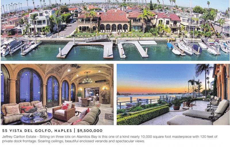 55 VISTA DEL GOLFO, NAPLES | $9,500,000 Jeffrey Carlton Estate - Sitting on three lots on Alamitos Bay is this one of a kind nearly 10,000 square foot masterpiece with 120 feet of private dock frontage. Soaring ceilings, beautiful enclosed veranda and spectacular views.