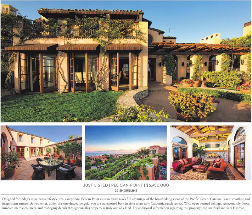 34 JUST LISTED | PELICAN POINT | $6,950,000 22 SHORELINE Designed for today's more causal lifestyle, this exceptional Pelican Point custom estate takes full advantage of the breathtaking views of the Pacific Ocean, Catalina Island, coastline and magnificent sunsets. As you enter, under the vine draped pergola, you are transported back in time to an early California ranch retreat. With open beamed ceilings, terracotta tile floors, tumbled marble counters, and mahogany details throughout, this property is truly one of a kind. For additional information regarding this property, contact Brad and Sara Hinman.
