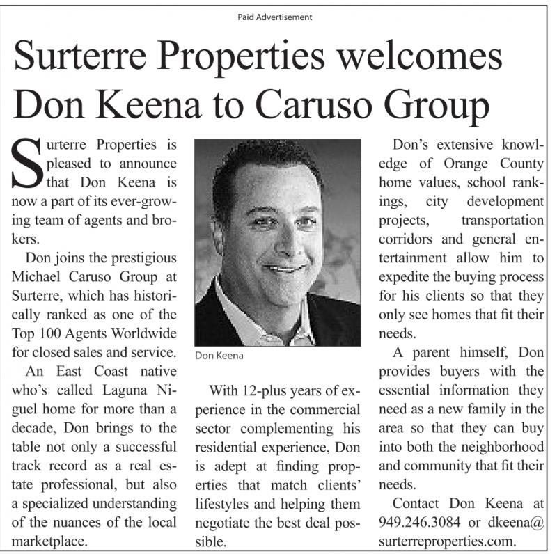 Surterre Properties is pleased to announce that Don Keena is now a part of its ever-growing team of agents and brokers. Don joins the prestigious Michael Caruso Group at Surterre, which has historically ranked as one of the Top 100 Agents Worldwide for closed sales and service. An East Coast native who’s called Laguna Niguel home for more than a decade, Don brings to the table not only a successful track record as a real estate professional, but also a specialized understanding of the nuances of the local marketplace. Paid Advertisement Surterre Properties welcomes Don Keena to Caruso Group DonKeena With 12-plus years of experience in the commercial sector complementing his residential experience, Don is adept at finding properties that match clients’ lifestyles and helping them negotiate the best deal possible. Don’s extensive knowledge of Orange County home values, school rankings, city development projects, transportation corridors and general entertainment allow him to expedite the buying process for his clients so that they only see homes that fit their needs. A parent himself, Don provides buyers with the essential information they need as a new family in the area so that they can buy into both the neighborhood and community that fit their needs. Contact Don Keena at 949.246.3084 or dkeena@ surterreproperties.com.