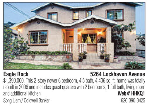 Eagle Rock 5264 Lockhaven Avenue $1,390,000. This2-story newer 6bedroom, 4.5bath, 4,406 sq.ft. home was totally rebuilt in 2006 and includes guest quarters with 2bedrooms, 1full bath, living room and additional kitchen. Web# HHKQ1 Song Liem /Coldwell Banker 626-390-0425