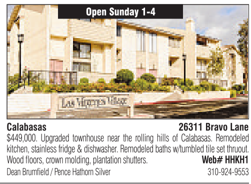 Open Sunday 1-4 Calabasas 26311 Bravo Lane $449,000. Upgraded townhouse near the rolling hills of Calabasas. Remodeled kitchen, stainless fridge & dishwasher. Remodeled baths w/tumbled tile set thruout. Wood floors, crownmolding, plantation shutters. Web# HHKH1 Dean Brumfield /Pence Hathorn Silver 310-924-9553