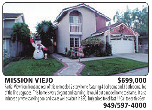 MISSION VIEJO $699,000 PartialView from frontand rear of this remodeled2storyhome featuring 4bedrooms and3bathrooms.Top of thelineupgrades. This home is very elegant and stunning.Itwould putamodelhometoshame. It also includes aprivatesparklingpooland spa as well as abuilt in BBQ. Trulypricedtosellfast !!! Call to seethis Gem! 949/597-4000