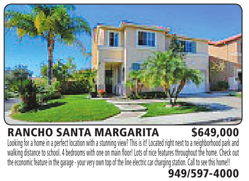RANCHO SANTA MARGARITA $649,000 Looking for ahome in aperfect location with astunning view? This is it! Located right next toaneighborhood park and walking distance toschool. 4bedrooms with one on main floor! Lots ofnice features throughout the home. Check out theeconomic feature in the garage-your very owntop of thelineelectriccar charging station. Call to see this home!! 949/597-4000