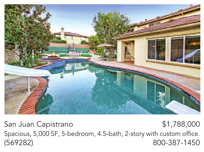 San Juan Capistrano $1,788,000 Spacious, 5,000 SF, 5-bedroom, 4.5-bath, 2-story with custom office. (569282) 800-387-1450
