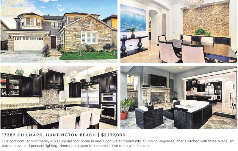 17382 CHILMARK, HUNTINGTON BEACH | $2,199,000 Five bedroom, approximately 4,500 square foot home in new Brightwater community. Stunning upgrades, chef's kitchen with three ovens, six burner stove and pendant lighting. Nano doors open to indoor/outdoor room with fireplace.