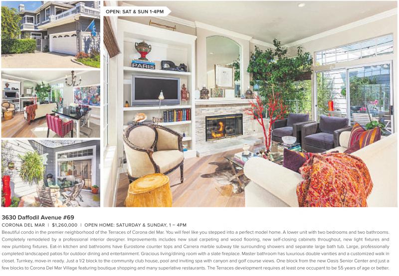 OPEN: SAT & SUN 1-4PM 3630 Daffodil Avenue #69 CORONA DEL MAR | $1,260,000 | OPEN HOME: SATURDAY & SUNDAY, 1 – 4PM Beautiful condo in the premier neighborhood of the Terraces of Corona del Mar. You will feel like you stepped into a perfect model home. A lower unit with two bedrooms and two bathrooms. Completely remodeled by a professional interior designer. Improvements includes new sisal carpeting and wood flooring, new self-closing cabinets throughout, new light fixtures and new plumbing fixtures. Eat-in kitchen and bathrooms have Eurostone counter tops and Carrera marble subway tile surrounding showers and separate large bath tub. Large, professionally completed landscaped patios for outdoor dining and entertainment. Gracious living/dining room with a slate fireplace. Master bathroom has luxurious double vanities and a customized walk in closet. Turnkey, move-in ready. Just a 1/2 block to the community club house, pool and inviting spa with canyon and golf course views. One block from the new Oasis Senior Center and just a few blocks to Corona Del Mar Village featuring boutique shopping and many superlative restaurants. The Terraces development requires at least one occupant to be 55 years of age or better.