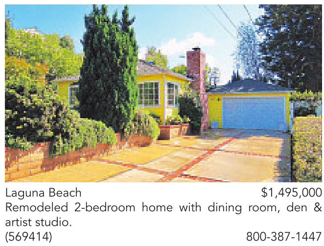 Laguna Beach $1,495,000 Remodeled 2-bedroom home with dining room, den & artist studio. (569414) 800-387-1447