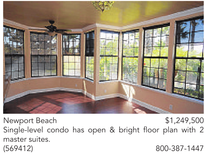 Newport Beach $1,249,500 Single-level condo has open & bright floor plan with 2 master suites. (569412) 800-387-1447