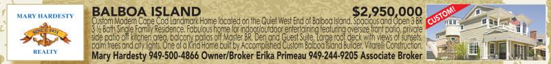MARY HARDESTY REALTY BALBOA ISLAND $2,950,000 Custom Modern Cape Cod Landmark Home located onthe Quiet West End of Balboa Island. Spacious and Open 3BR 3½Bath Single Family Residence. Fabulous home for indoor/outdoor entertaining featuring oversize front patio, private side patio off kitchen area, balcony patios off Master BR, Den and Guest Suite. Large roof deck with views of sunsets, palm treesand citylights. OneofaKindHome built by AccomplishedCustomBalboaIslandBuilder,Vitarelli Construction. Mary Hardesty 949-500-4866 Owner/Broker Erika Primeau 949-244-9205 Associate Broker