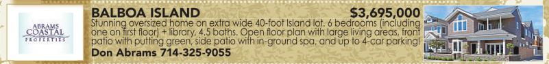 BALBOA ISLAND $3,695,000 Stunning oversized home on extra wide 40-foot Island lot. 6 bedrooms (including one on first floor) + library, 4.5 baths. Open floor plan with large living areas, front patio with putting green, side patio with in-ground spa, and up to 4-car parking! Don Abrams 714-325-9055