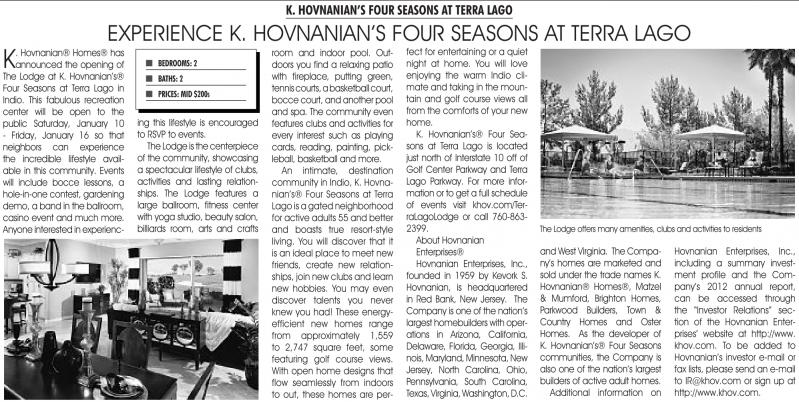 . Hovnanian® Homes® has announced the opening of The Lodge at K. Hovnanian’s® Four Seasons at Terra Lago in Indio. This fabulous recreation center will be open to the public Saturday, January 10 - Friday, January 16 so that neighbors can experience the incredible lifestyle available in this community. Events