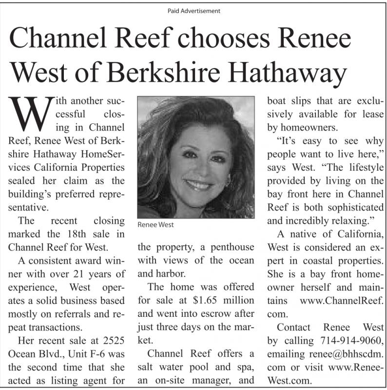 With another successful closing in Channel Reef, Renee West of Berkshire Hathaway HomeServices California Properties sealed her claim as the building’s preferred representative. The recent closing marked the 18th sale in Channel Reef for West. A consistent award winner with over 21 years of experience, West operates a solid business based mostly on referrals and repeat transactions. Her recent sale at 2525 Ocean Blvd., Unit F-6 was the second time that she acted as listing agent for Paid Advertisement Channel Reef chooses Renee West of Berkshire Hathaway ReneeWest the property, a penthouse with views of the ocean and harbor. The home was offered for sale at $1.65 million and went into escrow after just three days on the market. Channel Reef offers a salt water pool and spa, an on-site manager, and boat slips that are exclusively available for lease by homeowners. “It’s easy to see why people want to live here,” says West. “The lifestyle provided by living on the bay front here in Channel Reef is both sophisticated and incredibly relaxing.” A native of California, West is considered an expert in coastal properties. She is a bay front homeowner herself and maintains www.ChannelReef. com. Contact Renee West by calling 714-914-9060, emailing renee@bhhscdm. com or visit www.Renee- West.com.