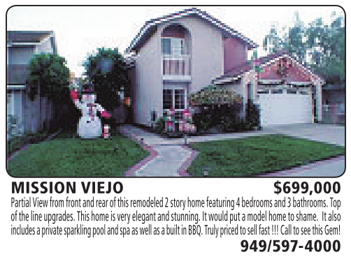 MISSION VIEJO $699,000 PartialView from frontand rear of this remodeled2storyhome featuring 4bedrooms and3bathrooms.Top of thelineupgrades. This home is very elegant and stunning.Itwould putamodelhometoshame. It also includes aprivatesparklingpooland spa as well as abuilt in BBQ. Trulypricedtosellfast !!! Call to seethis Gem! 949/597-4000