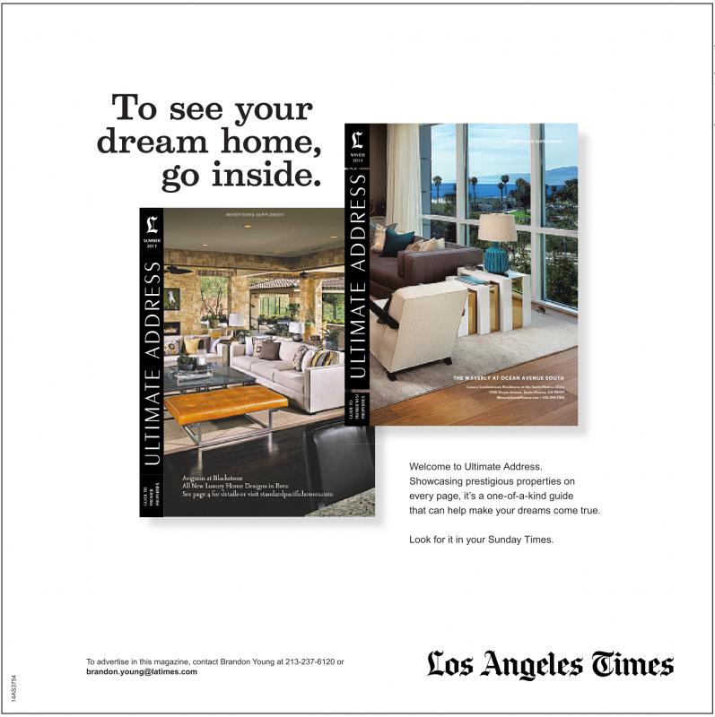To see your dream home, go inside. WINTER 2014 SUMMER 2013 THE WAVERLY AT OCEAN AVENUE SOUTH Luxury Condominium Residences at the Santa Monica Shore 1705 Ocean Avenue, Santa Monica, CA 90401 WaverlySantaMonica.com •310.394.1100 Welcome to Ultimate Address. Showcasing prestigious properties on every page, it’s a one-of-a-kind guide that can help make your dreams come true. Look for it in your Sunday Times. To advertise in this magazine, contact Brandon Young at 213-237-6120 or brandon.young@latimes.com
