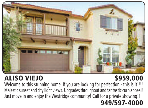 ALISO VIEJO $959,000 Welcome to this stunning home. Ifyou are looking for perfection -this is it!!!! Majesticsunsetand citylight views. Upgrades throughoutand fantasticcurbappeal! Just move in andenjoy theWestridge community! Call for aprivateshowing!!