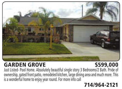 GARDEN GROVE $599,000 Just Listed- Pool Home. Absolutely beautiful single story 3Bedrooms/2 Bath. Pride of ownership, gatedfront patio, remodeledkitchen,large diningarea andmuchmore. This is awonderfulhome to enjoy yearround. For moreinfocall 714/964-2121