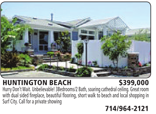 HUNTINGTON BEACH $399,000 Hurry Don’tWait. Unbelievable!3Bedrooms/2 Bath, soaring cathedral ceiling. Great room with dual sided fireplace, beautiful flooring, short walk tobeach and local shopping in SurfCity. Call for aprivateshowing 714/964-2121
