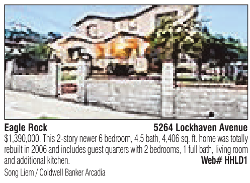 Eagle Rock 5264 Lockhaven Avenue $1,390,000. This 2-story newer 6bedroom, 4.5bath,4,406 sq. ft. homewas totally rebuilt in 2006 andincludes guest quarters with 2bedrooms, 1full bath, living room andadditional kitchen. Web# HHLD1 Song Liem /Coldwell Banker Arcadia