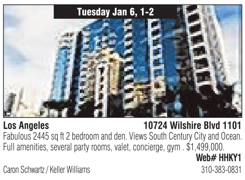 Tuesday Jan 6, 1-2 LosAngeles 10724 Wilshire Blvd 1101 Fabulous 2445 sq ft 2bedroom and den. Views South Century City and Ocean. Full amenities, several party rooms, valet, concierge, gym .$1,499,000. Web# HHKY1 Caron Schwartz /Keller Williams 310-383-0831