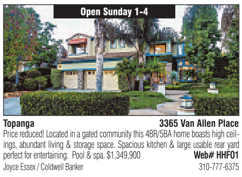 Joyce Essex /Coldwell Banker 310-777-6375 Topanga Open Sunday 1-4 3365 VanAllen Place Price reduced! Located in agated community this 4BR/5BA home boastshigh ceilings, abundant living &storage space. Spacious kitchen &large usable rear yard perfect forentertaining. Pool &spa. $1,349,900 Web# HHFO1
