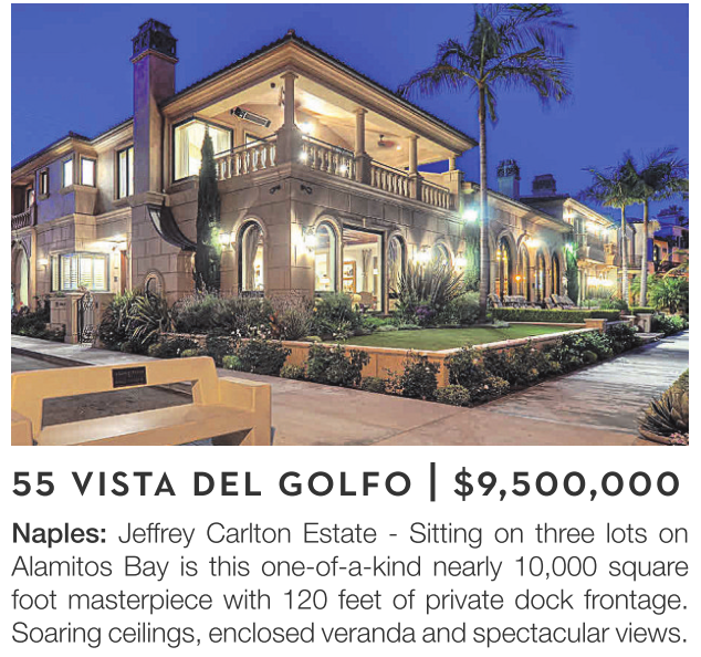 55 VISTA DEL GOLFO | $9,500,000 Naples: Jeffrey Carlton Estate - Sitting on three lots on Alamitos Bay is this one-of-a-kind nearly 10,000 square foot masterpiece with 120 feet of private dock frontage. Soaring ceilings, enclosed veranda and spectacular views.