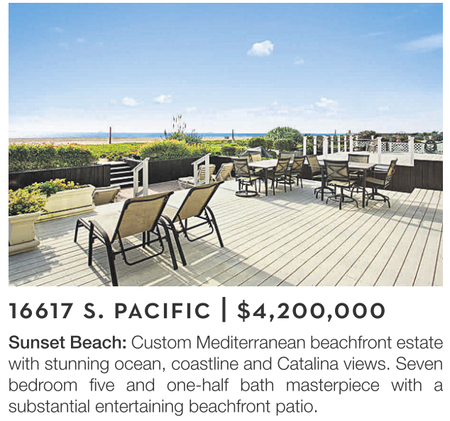 Sunset Beach: Custom Mediterranean beachfront estate with stunning ocean, coastline and Catalina views. Seven bedroom five and one-half bath masterpiece with a substantial entertaining beachfront patio.