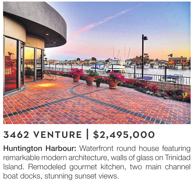 Huntington Harbour: Waterfront round house featuring remarkable modernarchitecture, walls of glass on Trinidad Island. Remodeled gourmet kitchen, two main channel boat docks, stunning sunset views.